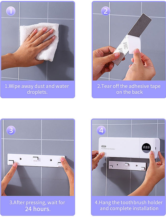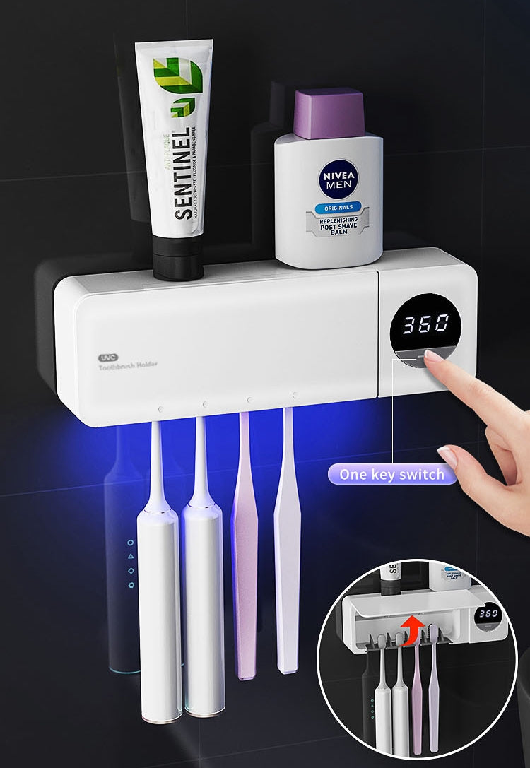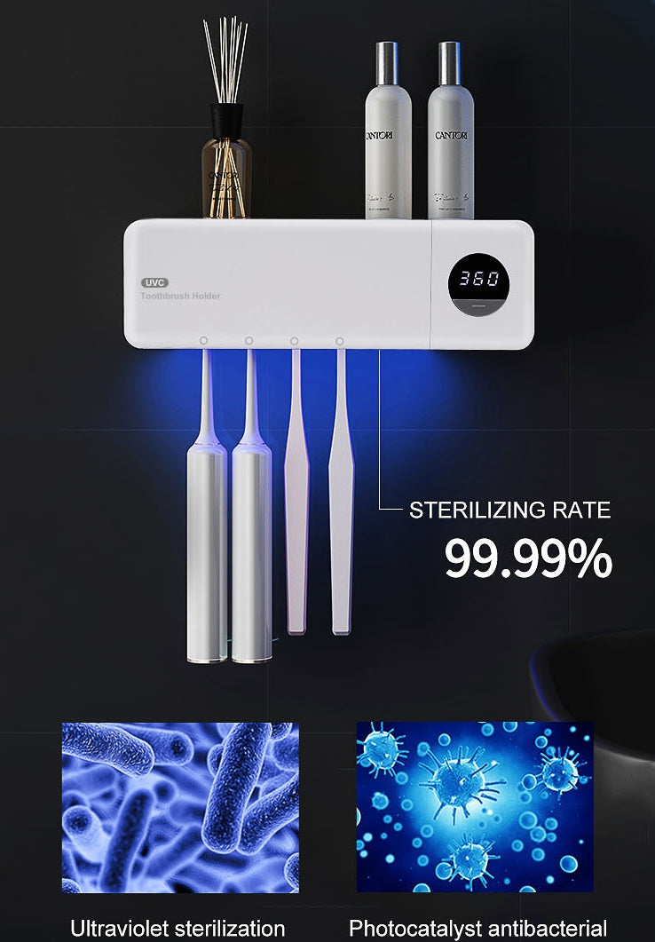 Med en inbyggd 360-sekunders timer desinficeras tandborstarna automatiskt, och lampan stängs av direkt när locket öppnas för extra säkerhet. Den är USB-uppladdningsbar, enkel att montera med medföljande självhäftande tejp och rymmer upp till fyra tandborstar.